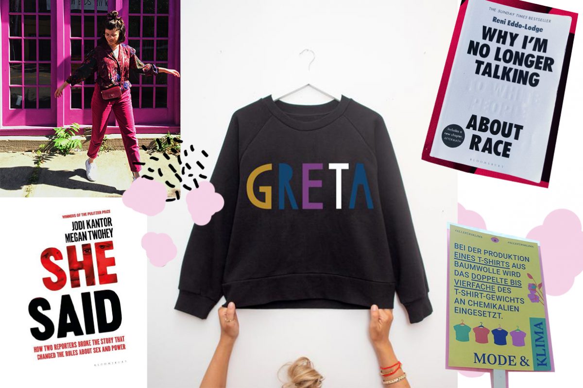 Ninas Pick: Vor ein paar Jahren hätte ich nicht gedacht, dass Statement-Shirts einmal großer Teil meiner Garderobe sein werden. Von „Stand up“ über „Future“ bis „Who made my clothes?“ ist alles dabei. Das ziehe ich nicht nur bei Demos oder Vorträgen an, sondern auch immer öfter privat – das Private ist schließlich politisch, wie Simone de Beauvoir einst feststellte. Nur im Winter wird es mit der aktivistischen T-Shirt-Garderobe etwas schwierig. Als ich im OhhhMhhh-Newsletter gesehen habe, dass The Colorful Crew im November einen GRETA-Pullover (!) rausbringt, musste ich den natürlich sofort vorbestellen (gibt es übrigens auch als T-Shirt). Der bunte Schriftzug ist im für das Label typischen Paperart-Look gestaltet, der Pullover im schwarzen Vintageton ist aus Bio-Baumwolle. Das Münchner Label spendet für jedes verkaufte Teil 2 Euro an Fridays For Future – richtig cool!