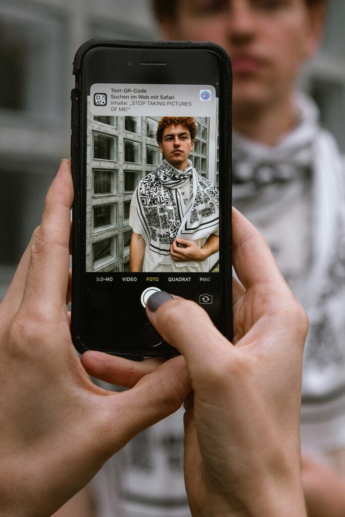Keine Lust, fotografiert zu werden? Der Urban Privacy Schal mit QR-Codes sendet eine unmissverständliche Botschaft an die ungefragten Fotograf*innen.