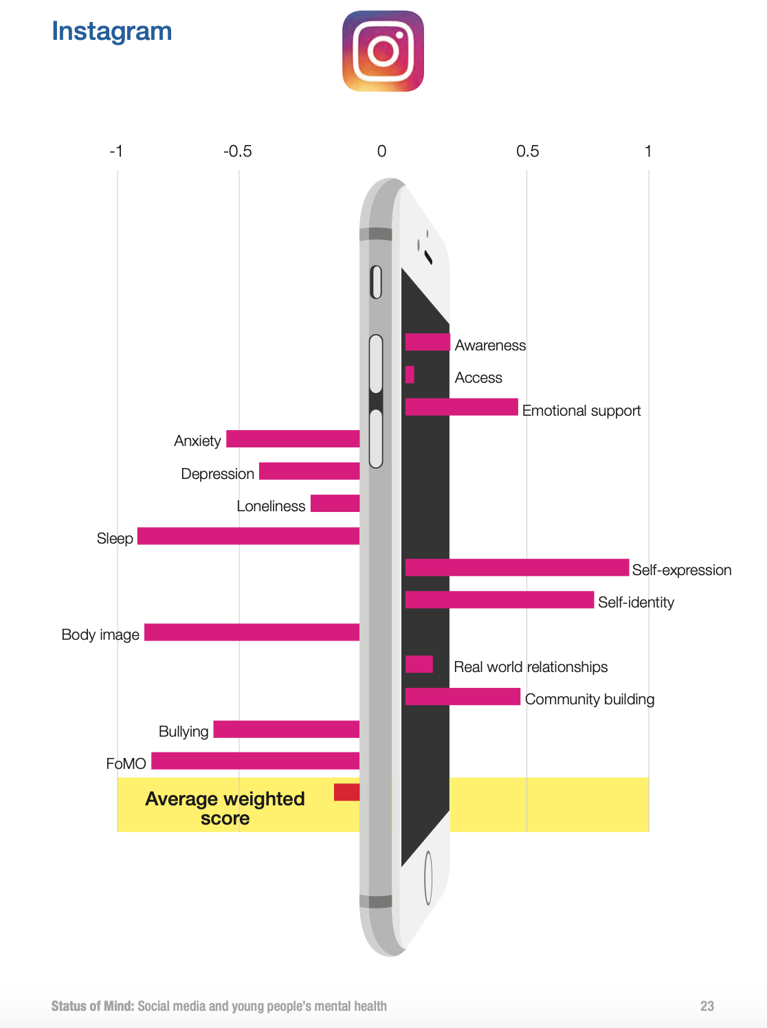Am schlechtesten schneidet das bildlastige Instagram ab: Es landet auf dem letzten, fünften Platz (außerdem haben die Wissenschafler*innen YouTube, Snapchat, Facebook und Twitter untersucht). Bezogen auf die Körperwahrnehmung hat Instagram den größten negativen Einfluss und liegt deutlich im problematischen Bereich.
